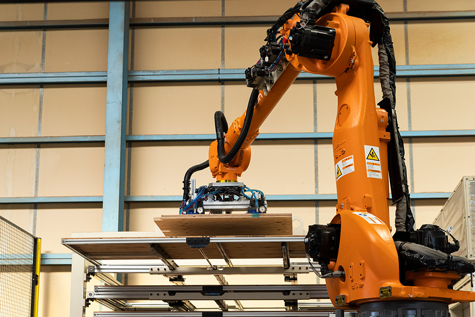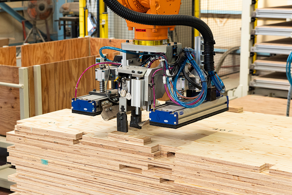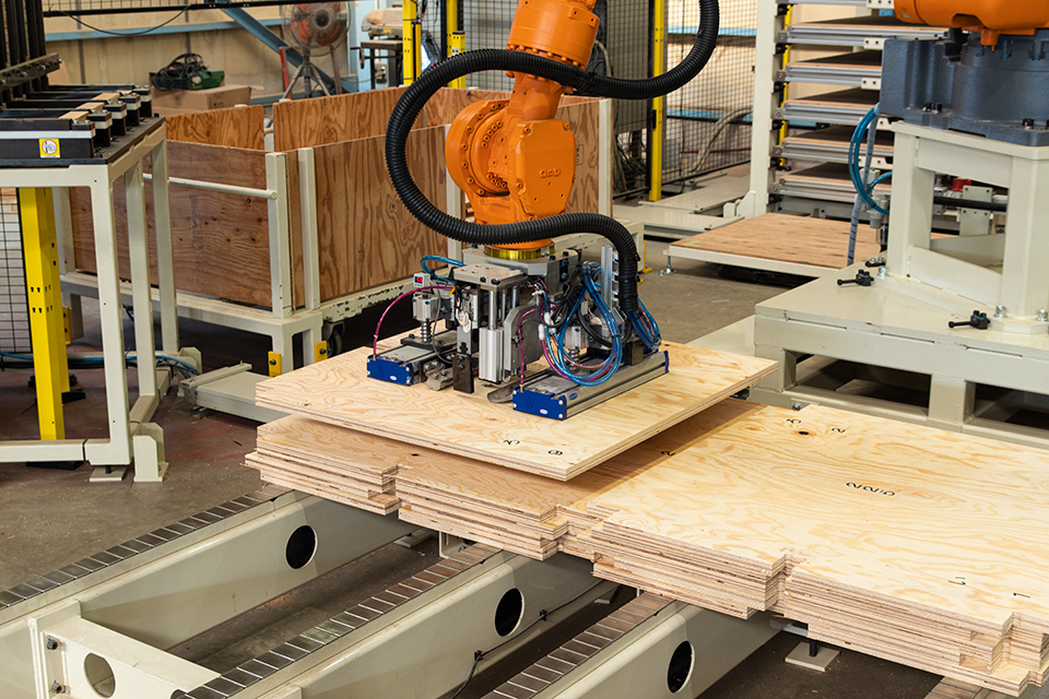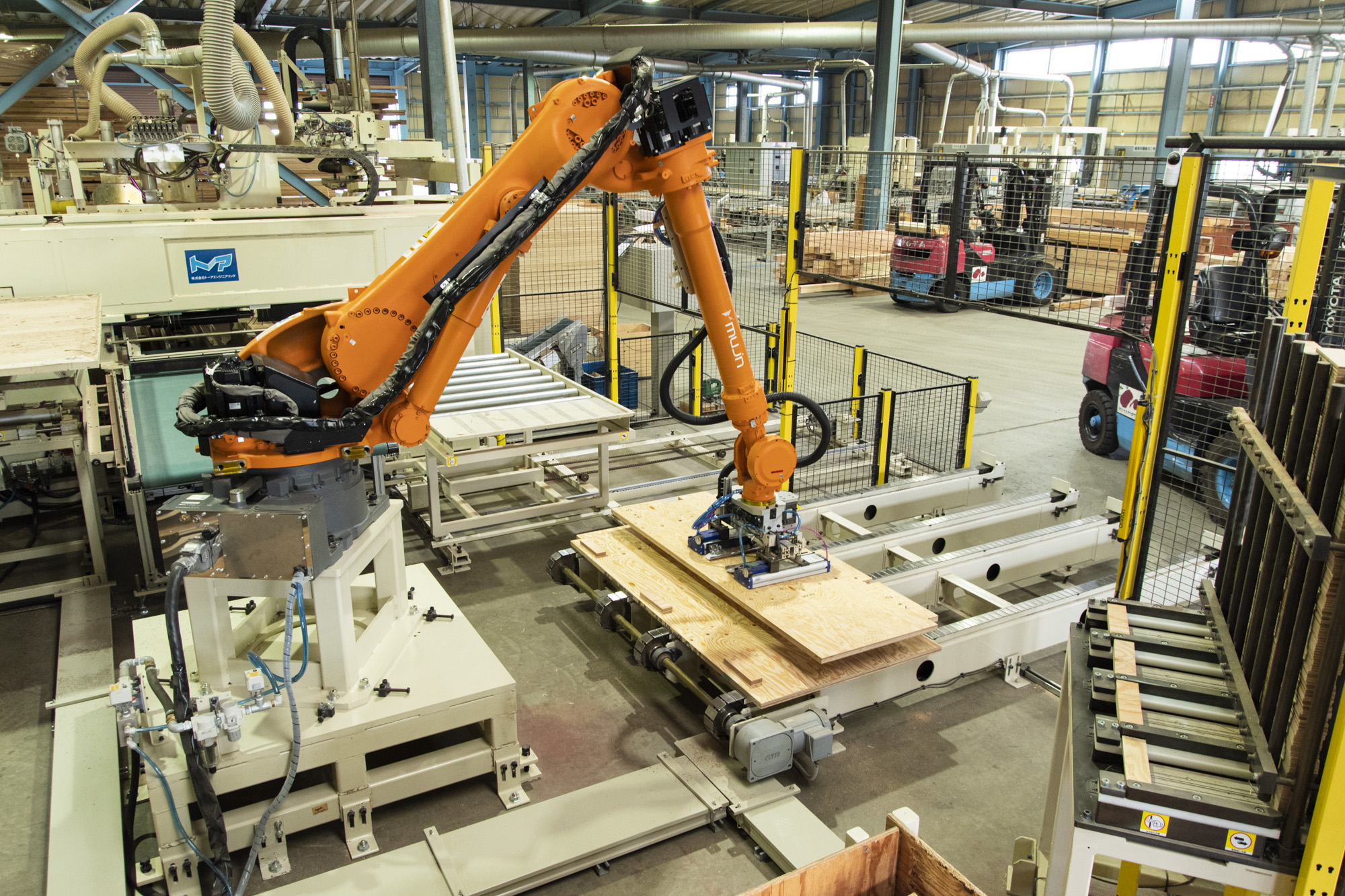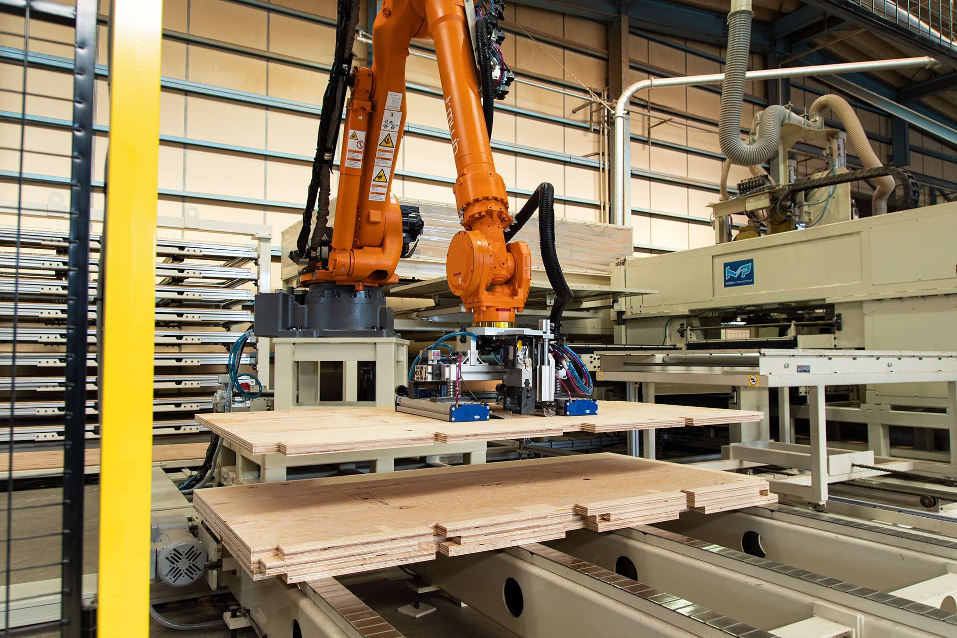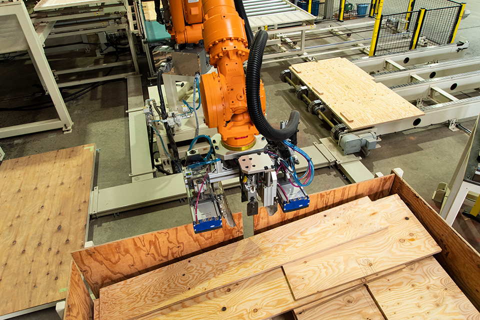 住宅建材生産の工業化が進み、建築現場に代わってプレカット工場が担う役割が大きくなった結果、木材の加工機への投入や切り出された建材の積み付けおよび梱包の負担が大きくなったと言われています。今回ロボットをプレカット工場で稼働させた宮本工業様とトーアエンジニアリング様に、生産現場における課題を伺いました。
