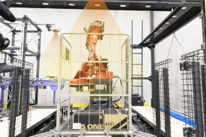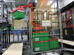 ・3Dビジョンでカゴ車のフレームを検知し、位置補正しながら積み付け実行