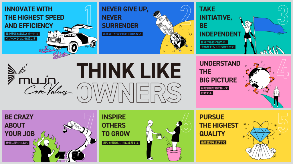 7つのバリューを元に、MUJINはさらに一丸となって、よりよい世界の実現のために挑戦を続けていきます。