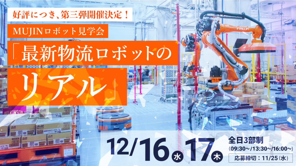 2020年9月・10月に開催したMUJINロボット見学会「最新物流ロボットのリアル」は、約500人の方にご来場いただき、大変ご好評をいただきました。つきましては、第三弾として、12月に追加開催が決定いたしました。この機会に是非ご参加くださいませ。
